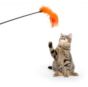 Setting up play sessions for your cat is essential for them to get physical exercise, as well as social bonding with you! The use of a simple feather toy gives them physical exercise which is imperative for our sleepy, indoor cats. Being active keeps them young and can also help to avoid common illnesses that cats can develop from a sedentary lifestyle.